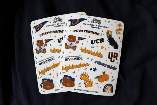 These UC Riverside Stickers include all of your favorite UCR traditions and symbols! Perfect for bullet journals, planners, scrapbooks, phone cases and more. Sticker bundles are great for student org events, finals care packages, and gifts!